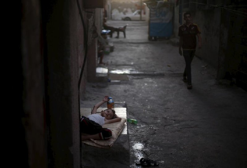 A Palestinian boy lies outside his family house to escape the heat during power cuts at Shatti (beach) refugee camp in Gaza City.